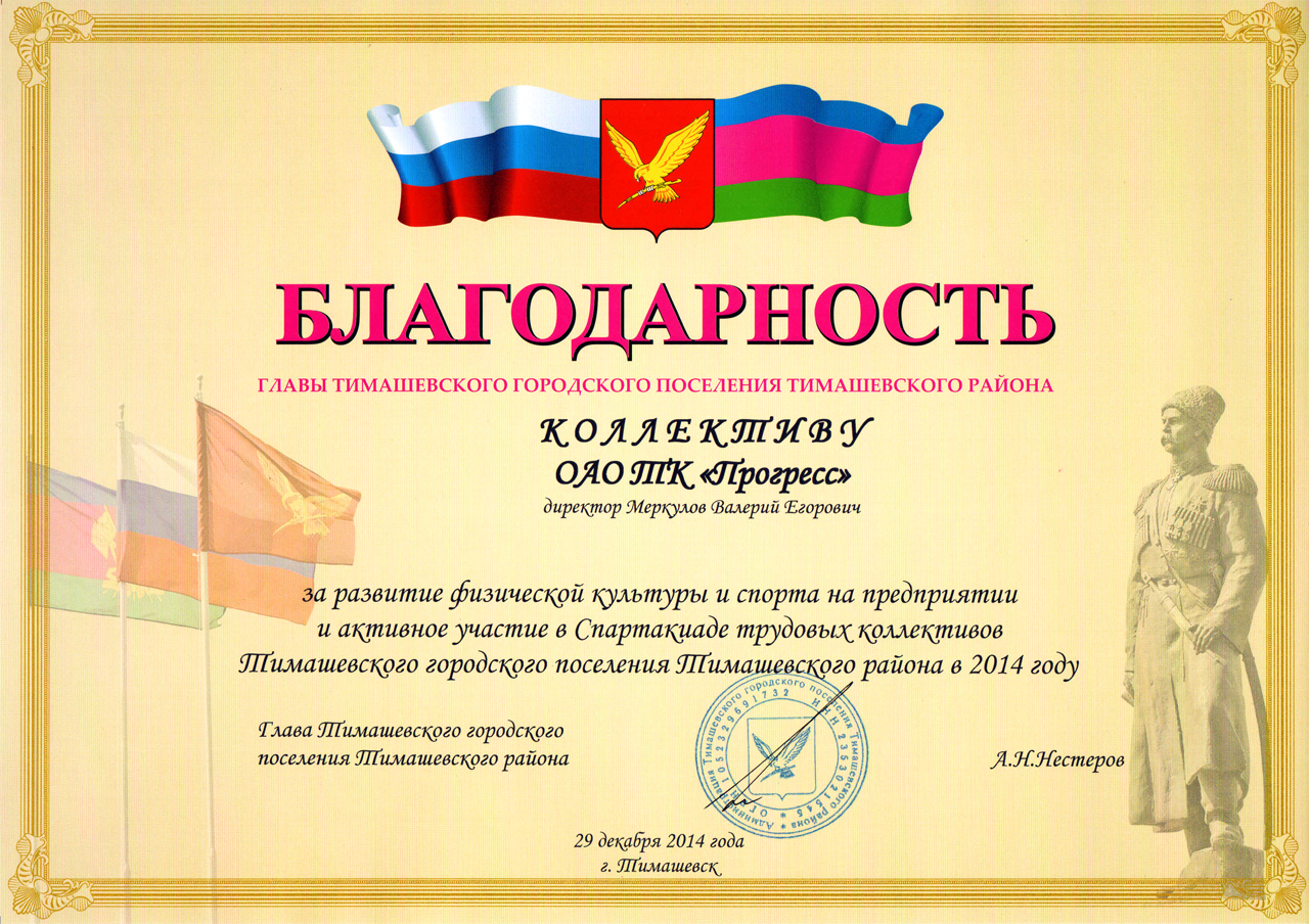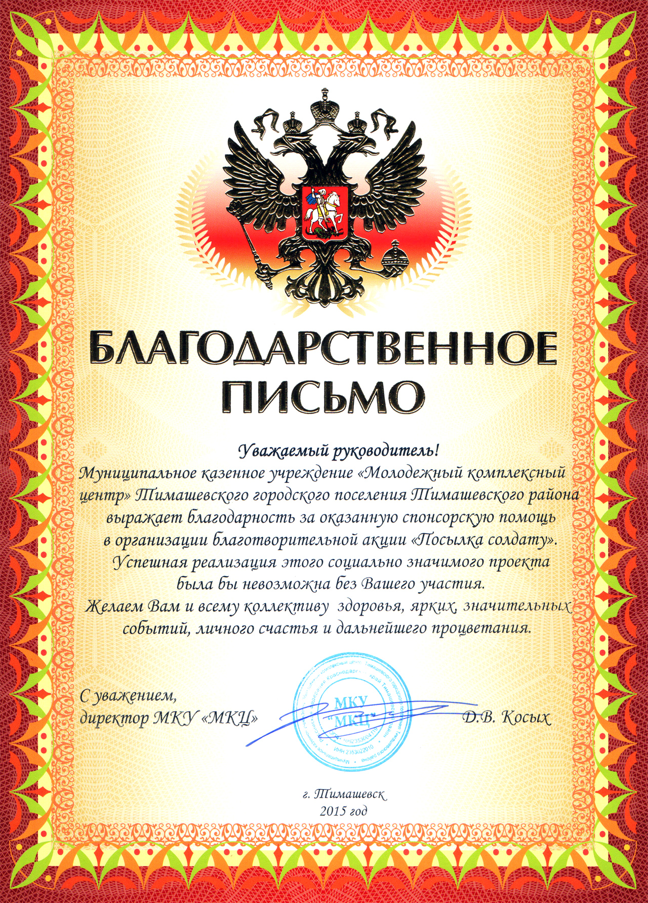 Благодарственное письмо МКУ "МКЦ", г. Тимашевск. 2015 г.