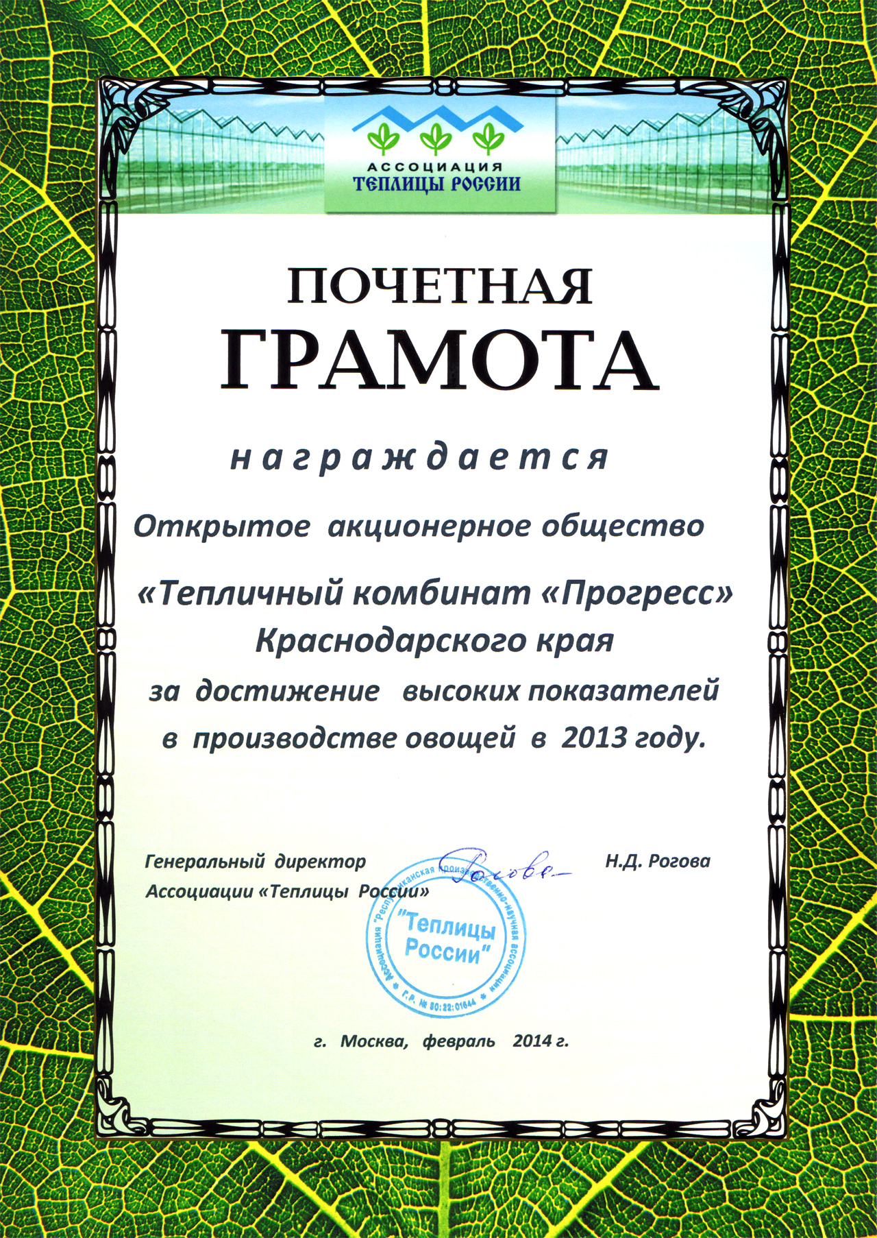 Почетная грамота Ассоциации "Теплицы Росии", 2014 г.